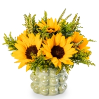 Bouquet with hydrangea, helianthus,spray roses, solidago and eustoma.