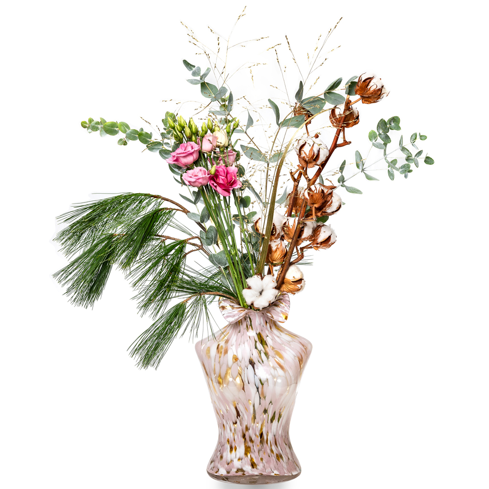 Γυναικεία φιγούρα βάζο σε ροζ-λευκό χρώμα με λυσίανθο και βαμβάκι