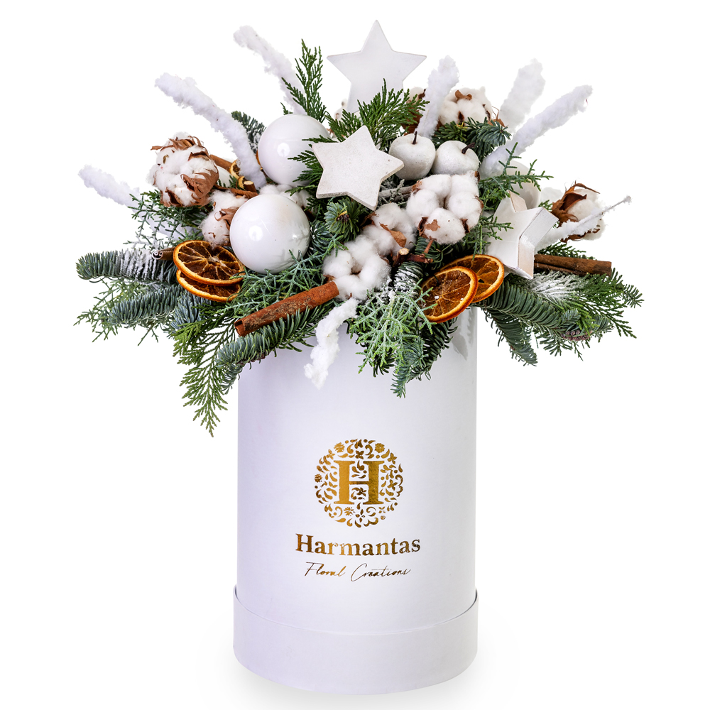Η σύνθεση αυτή αποτελείται από λευκά στολίδια, βαμβακι, φέτες πορτοκαλιού και έλατο.