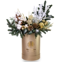 Λευκό γιορτινό κουτί με λευκά στολίδια και έλατο