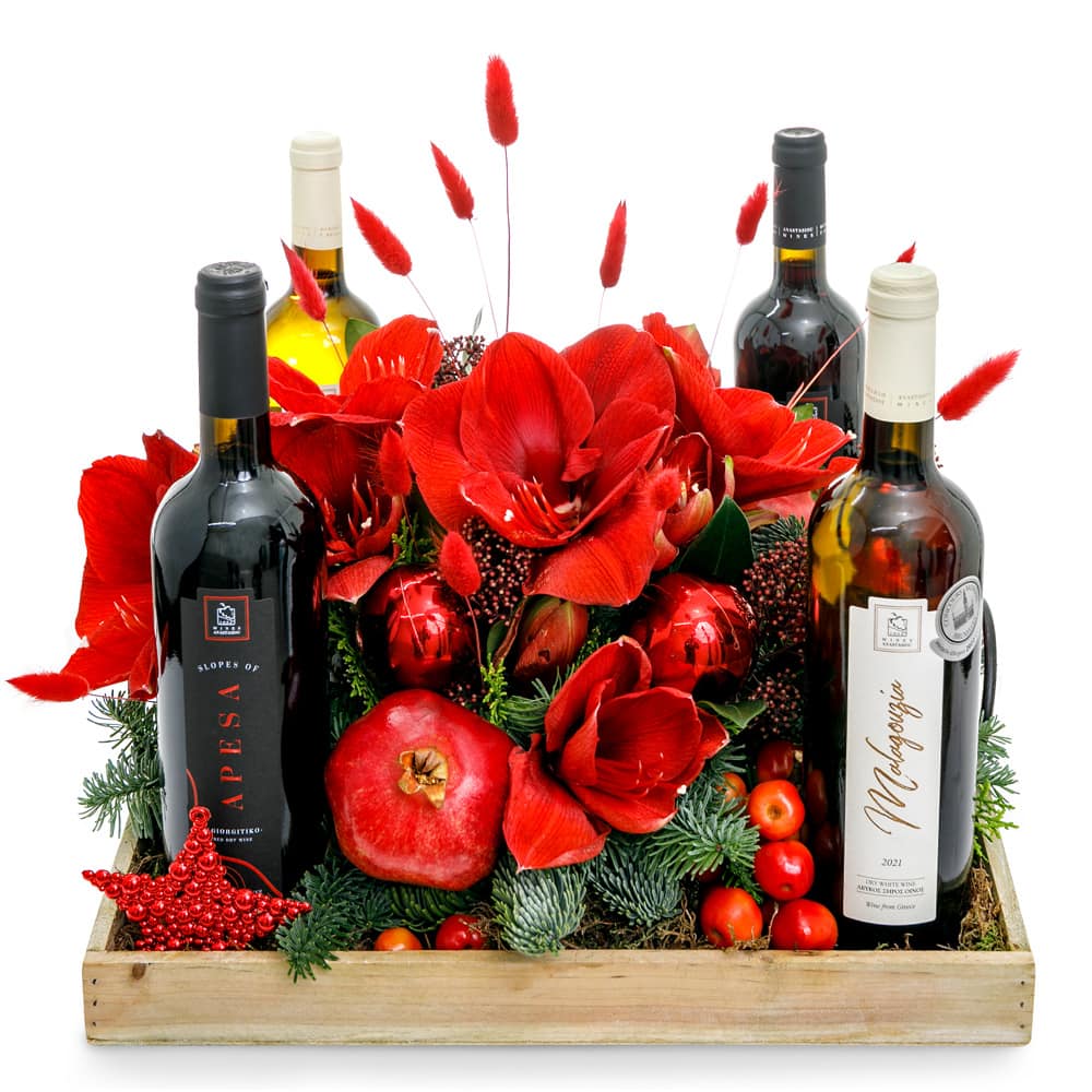 Ένας εντυπωσιακός και πλούσιος χριστουγεννιάτικος δίδκος με κρασιά και αμαρυλλίδες.