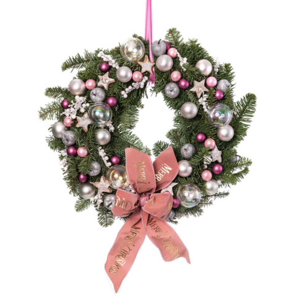 Χριστουγεννιάτικο στεφάνι με ροζ στολίδια και εντυπωσιακό φιόγκο