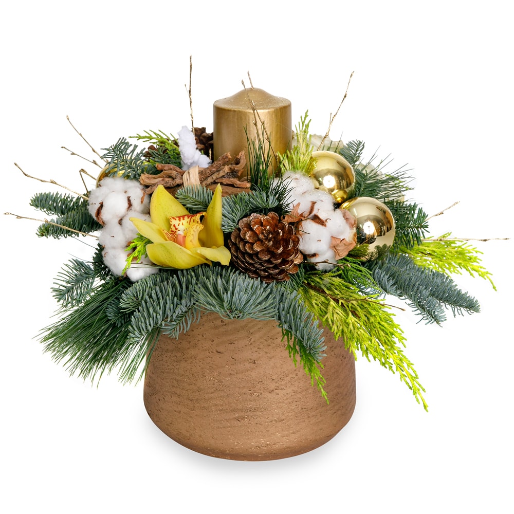 Χρυσή σύνθεση με έλατο, στολίδια και κερί σε πήλινο κασπώ