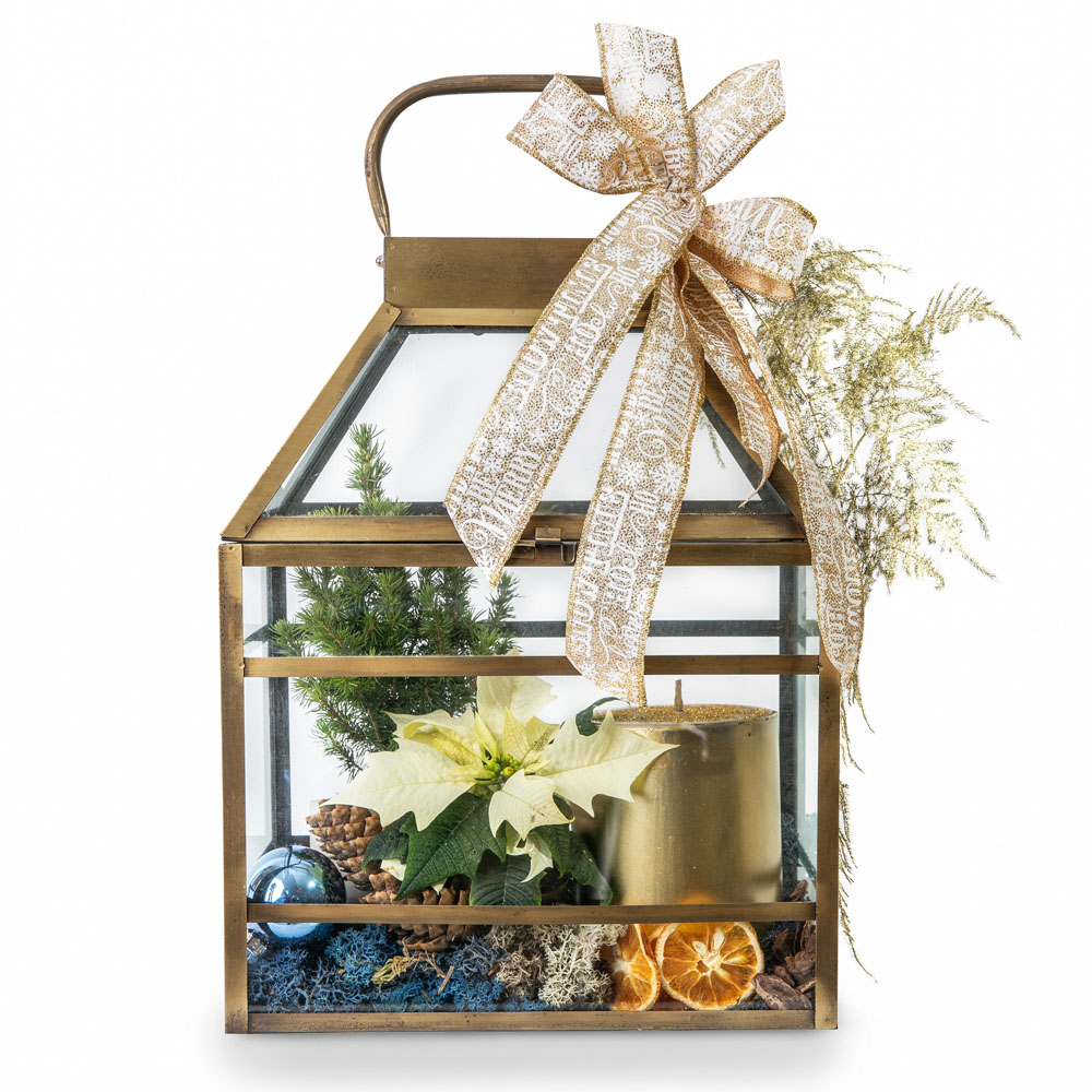 Ελατάκι, λευκό αλεξανδρινό, κερί και στολίδια σε ένα χρυσό φανάρι με μεγάλο φιόγκο.